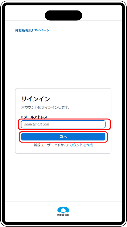 サインイン画面が開いたら、河北新報IDに登録しているメールアドレスを入力し、「次へ」をタップ。