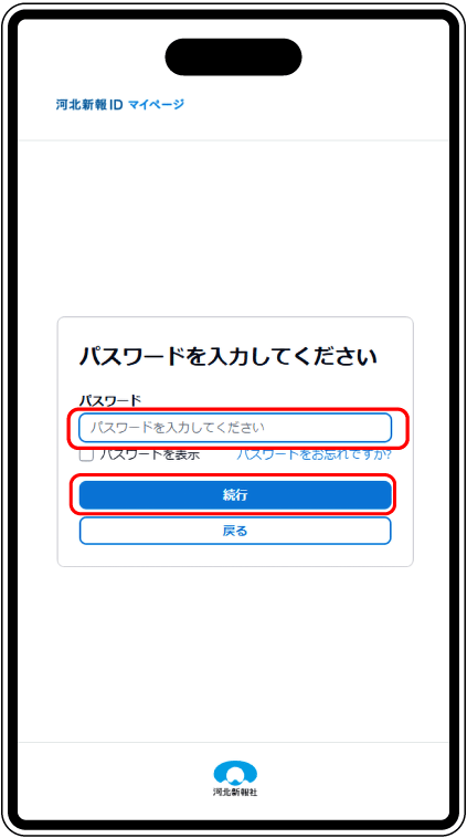 河北新報IDに登録しているパスワードを入力し、「続行」をタップ。