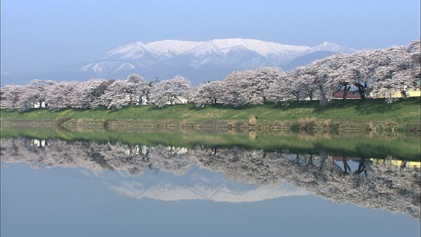 船岡城址公園とともに、宮城県で唯一「日本さくら名所100選」に選ばれた東北を代表する景勝地です。 写真を撮るなら、「しばた千桜橋」から残雪の蔵王連峰を背景に撮影するのがお薦め。時間が合えば桜並木の間を走る電車とのコラボレーションが見られます。 |
